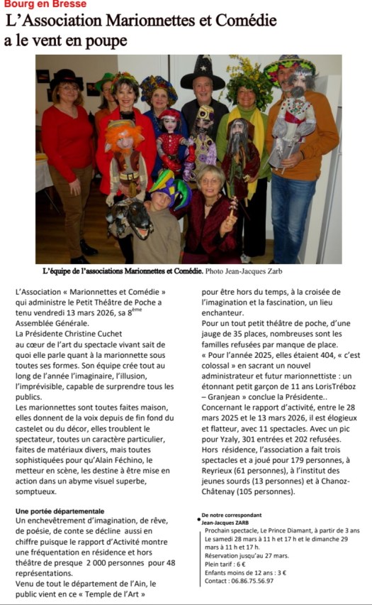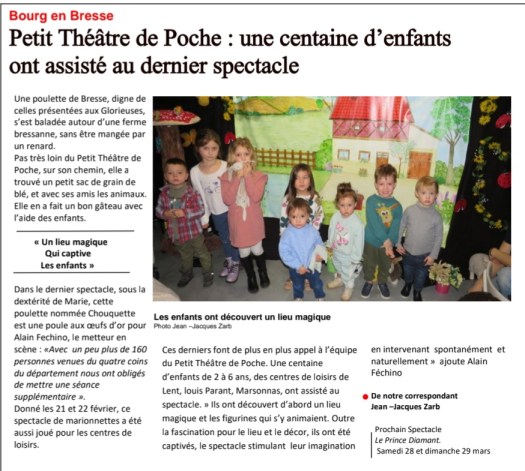 28 et 29 mars 2026 Le Prince Diamant13 mars 2026 8ème AG21 et 22 janvier 2026 Le Gâteau de Chouquette24 et 25 janvier 2026 Le Roi de la Forêt20 au 23 décembre 2025 Yzaly Rodolphe et le Père Noël29 et 30 novembre 2025 Le Champ du Merle Noir29 et 30 novembre 2025 Le Champ du Merle noir25 au 31 octobre 2025 Halloween Jack la Malice27 et 28 septembre 2025 Grignette la petite Fauvette02 juin 2025 hommages à notre équipe17et 18 mai 2025 Pompon et Pompoline12 et 13 avril 2025 Un point c’est tout28 mars 2025 7ème AG15 et 16 mars 2025 La souris qui cherchait un mari25 et 26 janvier 2025 Les dans le jardin de mon papy les Doudous14 au 23 décembre 2024 Yzaly, Rodolphe et le Père Noêl23 et 24 novembre 2024 Les 3 Petits Cochons27 au 31 octobre 2024 Halloween Sorcières et Sortilèges24 et 25 août 2024 Les 3 Soleils21 et 22 septembre 2024 Les 3 Soleils 12 août 2024 Réouverture des Portes8 et 9 juin 2024 Le Petit Caillou18 et 19 mai 2024 Le Petit Poisson Blanc20 et 21 avril 2024 Le Gâteau de Chouquette5 avril 2024 6ème AG17 et 18 Février 2024 Bébé Kola Les doudous20 et 21 janvier 2024 Pompon et Pompoline16 et 17 décembre 2023 Bébé Koala Les Doudous18 et 19 novembre 2023 Grignette la Petite Fauvette4 novembre 2023 Dédicace Christian Tisserand29 au 31 novembre 2023 Halloween Le Bal des Sorcières30 septembre et 1er octobre 2023 Le Gâteau de Chouquette16 et 19 août 2023 Le Chant de la Grenouille24 juillet 2023 Le Chant de la Grenouille 10 et 11 juin 2023 Le Petit Caillou13 et 14 mai 2023 Les 3 Petits Cochons21 au 23 avril Le Corbeau et le Renard24 au 26 mars 2023 Le Petit Cocon Voyageur17 mars 2023 5ème AG12 mars 2023 Le Petit Concon voyageur – Annonce25 et 26février 2023 Un point, c’est tout28 et 29 Janvier Les Doudous ont froid17 au 23 décembre 2022 La Fabrique du Père Noël17 au 23 décembre 2022 La Fabrique du Père Noël17 au 23 décembre 2022 La Fabrique du Père Noël17 au 23 décembre 2022 La Fabrique du Père Noël17 au 23 décembre 2022 La Fabrique du Père Noël26 et 27 novembre 2022 Le Roi de la forêt29, 30,31 octobre Halloween Sorcières et Sortilèges15 et 16 octobre 2022 Le Chant de la Grenouille24 et 25 septembre 2022 La Ferme de Monsieur Firmin23,24,25 août 2022 Minnie Petite Souris19 et 22 juillet 2020 Le Chant de la Grenouille19 et 22 juillet 2022 Le Chant de la Grenouille21 et 22 mai 2022 Le Petit Poisson Blanc9 et 10 avril 2022 Les 3 Petits Cochons9 et 10 avril 2022 Les 3 Petits Cochons25, 26,27 mars 2022 Courges en Bresse26 et 27 février 2022 Un point, c’est tout22 février 2022 Alice une stagiaire au Petit Théâtre26 janvier 2022 Chantal Grand la Trésorière18 au 23 décembre 2021 Yzaly, Rodolphe et le Père Noël20 et 21 novembre 2021 Grignette la Petite Fauvette30 et 31 octobre 2021 Sorcières et Sortilèges12 mars 2021 3ème AG2 et 3 octobre 2021 Le Petit Caillou17, 20 Août, 11 septembre Pipolo et Lola26 et 27 juin Le Petit Poisson Blanc12 et 13 juin 2021 Les 3 Petits Cochons12 et 13 juin Réouverture des portes après 15 mois de fermeture post Covid10 et 11 octobre 2020 Un Point c’est tout12 et 13 septembre 2020 Pompon et Pompoline15 et 16 février 2020 Le Petit Caillou14 janvier et 1er février 2020 Le Roi de la Forêt31 décembre 2019 Coup de Projecteur salué par le journal Le Progrès31 décembre 2019 Coup de projecteur salué par le journal le Progrès21,22,23,24 décembre 2019 La Fabrique du Père Noël24 novembre 2019 Les 3 Petits Cochons6 octobre 2019 Un Point c’est tout25 septembre 2019 Conférence de Presse